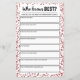 Dois jogos em um! Se você está querendo adicionar um pouco de diversão extra a uma comemoração do 40º aniversário do Ruby Wedding, então nossa gama de jogos é perfeita. Este Quem Sabe Melhor Jogo é excelente para todos descobrirem como eles conhecem bem o casal. Do lado oposto está um teste de Ele ou de Ela. Todo o texto é editável, para que você possa mudar o 'Ele' e 'Ela' para os nomes do casal de aniversário. Você também pode mudar as perguntas para torná-las mais pessoais. Basta clicar em 'Personalizar' na página do produto. Este jogo também está disponível como um impressão para impressão (em casa) como parte de nossos feixes de jogos de aniversário de casamento. Veja aqui: https://etsy.me/3zbkfkR