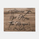 Quer você viva numa fazenda rural ou nos subúrbios, cada entrada precisa de um tapete de boas-vindas. Faça seus visitantes se sentirem um pouco em casa enquanto caminham até a porta e se preparam para bater. Padrão de fotografia de madeira de celeiro russo como fundo. Bem-vindos à nossa casa com um nome de família personalizável como texto. Perfeito como presente de aquecimento da casa ou faça disso seu hóspede primeiro sinal para entrar, chutar seus calçados e se preparar para uma noite divertida de entretenimento.