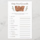 Cartão de palavras de bebê chá de fraldas dos gêmeos com tema de ursos bonitos, com ilustração de filhotes. A lista de palavras neste cartão está relacionada com bebês e eles estão embaralhados. Os hóspedes vão competir quem pode desembaraçar todos eles primeiro! CHAVE DE RESPOSTA: 1. cadeirinho 2. leite 3. caneta de recreio 4. pacificador 5. fralda 6. cadeira de balanço 7. berçário 8. baby monitor 9. pastilha 10. fórmula 11. rolete de borracha 12.