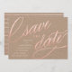 Os "save the dates" rústicos e elegantes em rosa dourado apresentam letras sofisticadas num efeito de folha de rosa dourado falso num fundo cinza, com os detalhes do anúncio do casamento em branco. O verso apresenta um padrão de listras rosa dourado moderno.