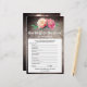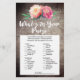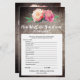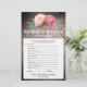 Este jogo de flor rústica "como você conhece a noiva" é perfeito para um chá de panela de tema do país floral. A frente do cartão de jogo apresenta "como você conhece bem a noiva", e a parte de trás do cartão contém "o que há na bolsa". O design apresenta um arranjo elegante de peônias cor-de-água rosa e pinceladas em um fundo texturizado de madeira. Personalize a parte frontal da placa com o nome da noiva e a data do chá de panela.