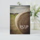Personalize o charmoso cartão de resposta RSVP RSVP RSVP RSAL RSY Bales Rústicos Hay Ranch com a data de resposta do seu casamento específico. Estes cartões de casamento r.s.v.p. personalizados e casuais apresentam uma fotografia de fazenda rural de fardos de feno redondos espalhados em uma pastagem verde em um dia do céu azul com nuvens brancas dispersas.