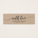Este cartão rústico mini kraft com as palavras "com amor" em escrita relaxada de cinza escura faz uma etiqueta de favor de casamento de excelente. É fácil personalizar; basta substituir o texto do marcador de posição para adicionar suas próprias informações. Para obter mais opções, como alterar a fonte, o tamanho do texto ou o espaçamento entre letras, clique no botão "Personalizar". *Observe que a Marca d'água do Zazzle que aparece na visualização de zoom NÃO aparecerá no produto impresso final. © Rosewood e Citrus