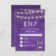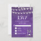 Cartões RSVP de Casamentos Russos Ultra Violet apresentam fundo fotográfico de madeira, cordas de luzes brilhantes e jarro de pedras com uma vela. Misturar e combinar estes cartões RSVP de casamento com a nossa coleção de papelaria de casamento e favores.