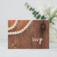 Personalize o charmoso e elegante cartão de resposta RSVP de Casamento RSVP de Pérolas Rústicas e Rústicos da Madeira em Barn com a data de resposta do seu casamento. Esta placa casual, porém clássica, do estilo rancho r.s.v.p. apresenta uma fotografia escura de um colar branco de pérolas e madeira de celeiro marrom de caserna com uma cabeça enferrujada de unhas.