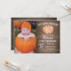 Rustic Pumpkin First Birthday Invitation com foto personalizada. Fundo de madeira russa. A Festa de Meninos ou Meninos Convidam. segundo 13º 5 4º 6 8º 10º 7, Qualquer Idade. Para mais personalização, clique no botão "Personalizar" e use nossa ferramenta de design para modificar este modelo.