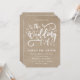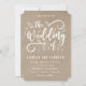 Estes belos convites para o casamento contêm as palavras "o Casamento de" numa fonte moderna, desenhada à mão, com folhas e elementos de espiral (em branco) sobre um fundo de papel kraft falso. Uma design simples e rústica para seu dia especial!