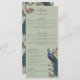 Este elegante e sábio menu de casamento completo apresenta ilustrações desenhadas à mão do estilo "Chinoiserie" de um pavão azul e lacrimogêneo cercado por Magnolia greenery, mostrando creme vibrante e flores cor-de-magnólia cor-de-rosa esmagadas, todas contra um elegante fundo verde-sábio. O verso apresenta um elegante padrão floral e de pássaros com ilustrações coordenadas. Todo texto é editável. Personalize com seus detalhes de casamento, incluindo nomes de noiva e noivo, aperitivo, curso principal, mesa de sobremesa e bebidas.
