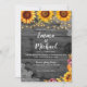 Ponha o tom para a sua celebração rústica com este convite para o casamento de girassol com luzes brilhantes de cordas, girassóis amarelos brilhantes, florais burgundy e um delicado cadarço branco sobre um fundo de madeira azul escuro. O design quente e charmoso é perfeito para casamentos de campo, cerimônias de outono, locais de celeiro ou temas de fazenda. Totalmente personalizável com seus nomes, data, local e texto — este convite é parte de uma suíte coordenada para um visual coeso do dia do casamento.