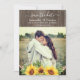 Um belo casamento inspirado em vassoura, exceto a data com flores de sol a cores rústicas, penas e folhas verdes escamosas complementadas com elegante texto marrom-terra. Personalize com a sua própria redação! Se quiser alterar o estilo da fonte, a cor ou o posicionamento do texto, basta clicar no botão "Personalizar Mais".