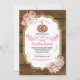 O chá de fraldas do tema "abóbora" é bonito, com brilho cor-de-rosa e dourado, e fundo de madeira rústica.