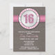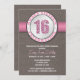 Pintura personalizada Doce 16 (16) marco Aniversário Convites com uma ilustração brilhante impressa para o "16" em um design emblema "SEXTA CELEBRAÇÃO", sobre uma imagem de textura de canvas de cinza escura e rústica.