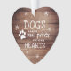 Honre a memória do seu amado animal de estimação com este Enfeites de natal animador. Um presente perfeito para seus amigos, família ou para você. O texto diz "Cachorros deixam pegadas no coração" com um fundo de madeira rústico. Apresenta uma grande foto do seu animal de estimação no sentido inverso.