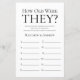 Esta linda folha de jogo de chá de panela "Quantos Anos Eles Tinham?" é simples e encantadora - perfeita para qualquer chá de panela que celebre 2 noivos. Este jogo divertido e fácil certamente trará muitas risadas para qualquer chá de panela! Peça que familiares e amigos lhe enviem fotos dos noivos em diferentes idades e as imprimam. Numere-as e coloque-as perto destas folhas de jogo. Simplesmente dê uma folha para cada convidado (não esqueça as canetas) e deixe a competição começar! Você ficará surpreso com quantas pessoas realmente sabem as idades dos noivos. Em segundos você pode ver como sua folha de jogo ficará. Basta selecionar "Personalizar este Modelo" e digitar os nomes dos noivos.