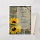 Personalize o menu informal, porém elegante, Rustic Sunflower e Wagon Wheel Country Wedding, com os detalhes da refeição que você servirá no seu chá de panela do rancho ocidental, janto de recepção de casamento ou posto de brunch de casamento. Personalize-o com os nomes da noiva e noiva, local e data. Este charmoso menu nupcial floral personalizado apresenta uma fotografia floral fino e pintada digitalmente de flores de girassol amarelas e uma velha roda de vagão enferrujada.