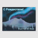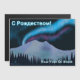 Luzes de norte roxas e azuis brilham sobre montanhas cobertas de neve em uma noite fria no Alasca. O texto cirílico (russo) com a leitura de "S Rozhdestvom" (С Р д е о ж с т вом- Uma saudação de Natal russa) aparece em azul e branco brilhantes. Adicione seu próprio texto adicional.