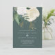 Um convite de casamento moderno e romântico, perfeito para um outono ou casamento no inverno. Esta design apresenta uma cascata de rosas de aquarelas em branco e marfim, folhas verdes e uma poeira de brilho sujo, sobre fundo verde-escuro. O reverso também está em verde escuro sólido.