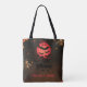 Bolsa tote ousada de Halloween com uma lua vermelha impressionante cercada por morcegos voando e um fundo atmosférico escuro. O contraste dramático e o design de silhueta assustadora criam um acessório festivo e elegante, perfeito para a temporada de Halloween.