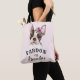 Esta bolsa de tote divertida tem um cachorrinho branco e castanho-claro, Bulldog Francês com um pequeno buquê de flores roxas, cor de pêssego, verdes e aquarelas e folhas sentadas em sua testa. O texto personalizável diz "Perdoe meu francês".