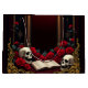 Amor eterno nas sombras da escuridão, no estilo gótico. O ponto focal é um arco gótico majestoso decorado com detalhes delicados de ouro e brilhando sobre um fundo vermelho profundo. As duas colunas elegantes que flanqueam o arco-íris adicionam um toque sublime ao design e enfatizam o design opulente. O coração balançando suavemente do arco-íris desenhar o olho e é enquadrado por um efeito sanguíneo que goteja,