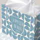 Transforme seu presente de aniversário com este saco de presentes moderno do médio na moda! Um design geométrico, com círculos e semicírculos, criando um padrão abstrato em azul e branco. Basta adicionar o nome do destinatário e a idade celebrada para torná-lo único. O presente personalizado é uma maneira perfeita de adicionar um toque especial aos presentes para a família e os amigos!