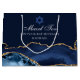 O azul e o ouro marinho elegantes decoram o lado deste saco de presentes moderno Bat ou Bar Mitzvah. Mazel Tov! Personalize-o sob a Estrela de David. Presente perfeito para uma família na moda judia.