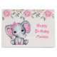 Saco de presentes com uma ilustração de aquarela de elefante rosa giro. Ela tem orelhas bonitinhas, cor-de-rosa e bolinhas branca e arco bonito de fita rosa sobre a cabeça. O topo é decorado com um belo buquê de rosa.
