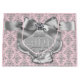 Saco de presente para chá de bebê de menina com um lindo laço de diamante prateado e sapatinho sobre um elegante fundo damasco prateado. Este saco de presente para bebê menina é facilmente personalizado alterando a cor do fundo.