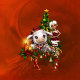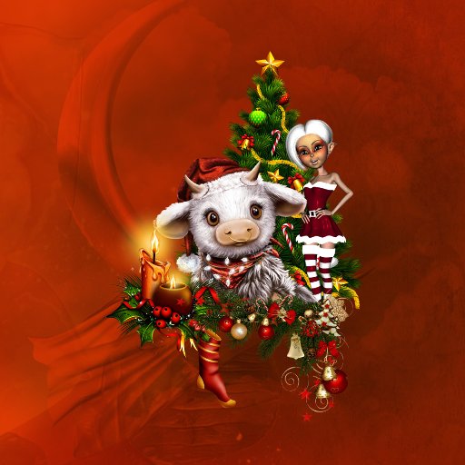 Bela vaca de natal com pequeno elfo e árvore de natal