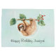 Saco de presentes com uma preguiça adorável pendurada de cabeça para baixo de um galho de árvore. Ramo de árvore é decorado com folhas e bagas tropicais. Colocado sobre um fundo verde-claro.