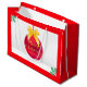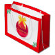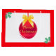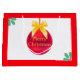 Bola vermelha de Natal com fita amarela no centro em um saco de prenda branco de fundo. O texto pode ser personalizado.