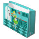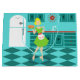 Com este Saco de Presente da Cozinha Retro, você pode pegar sua torta e comê-la também. Este desenho de arte kitschy, minimalista apresenta uma esposa perfeita da década de 1950, em sua cozinha moderna de meio século. O belo padeiro está vestindo uma piscadela, um vestido verde e um avental branco com detalhes vermelhos. Nem um cabelo na cabeça loira dela está fora do lugar. Em uma mão, ela está segurando a fruta de seu trabalho — uma linda torta de latice, fruta. Um relance e saberás que as suas picadas de torta são inigualáveis. Ela está parada num aqua e no chão do tabuleiro de xadrez, que é, sem dúvida, limpo o suficiente para comer fora. Contra uma parede aqua, vemos uma cabine de chá com um trabalho de caimento aqua, um contrapeso vermelho, puxações de gavetas vermelhas e sotaques de estrelas pretas. Um relógio vermelho e estrelado está pendurado na parede. Ao lado, há uma geladeira branca de ponta, com alças de prata. Pelo menos, a geladeira foi o estado da arte na década de 1950. Agora, é apenas um sonho simples! Quer você seja Suzie Homemaker ou simplesmente tenha uma afinidade por todas as coisas vintage, você certamente vai adorar esta fatia esfarrapada de Americanas.