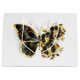 Borboleta de flores Dourada com orquídea de joias pretas, decorada com folhas de ouro sobre fundo branco.
