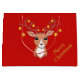 Veado de Natal bonito no centro em saco de prenda vermelho. A rena é decorada com bolas de ouro.