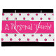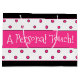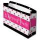 Mala de compras de papel rosado e pontilhado de polca com alças. Personalize o texto no seu próprio lema de loja, adicione o logotipo da sua empresa também para torná-lo seu próprio. Todas as cores podem ser alteradas para sua própria cor de loja ou cores de evento. Saco de presente de designer adequado para qualquer ocasião. As cores são rosa claro, preto e branco.