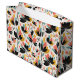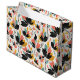 Uma Grande Bolsa de Presente Projetada em Cores Retrô de Preto, Azul Turquesa, Dourado e Laranja com um Design de Folha Floral