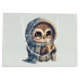 Saco de presentes com uma ilustração kawaii de uma coruja de olhos grandes em um roupão de inverno e cachecol segurando um café quente.