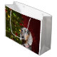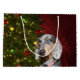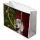 Dachshund apedrejado de cabelo curto, ou cão desmamado, rosto com uma árvore de Natal e cores de Natal no cão-de-fundo amante um grande saco de presentes de Natal