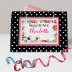 Personalize esta bolsa de presente de aniversário grande e fofo com o nome do seu filho. Design num tema de joanilha de flores brancas, bolinhas pretas e joaninhas cor-de-rosa-escuro. Consulte papel de empacotamento correspondente, etiquetas de presentes e outros itens de coordenação nesta mesma coleção. Criada em parte com gráficos pela Trina Clark comprada em digiscrapkits.com