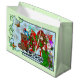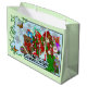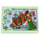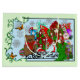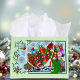 Uma fada toda vermelha e verde num pano de fundo de flocos de neve. Ao redor dela estão símbolos dos feriados.