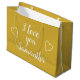 Dourada bolsa de presente com corações, que você pode personalizar facilmente com o nome do seu querido.