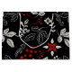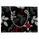 Elegant botanical pattern on black background featuring white leaves, red berries, and intricate floral designs in gold accents, creating a festive, decorative feel.