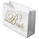 Grande bolsa de presente da Noiva. Escrito em ouro elegante Bride em fundo branco com data de casamento em texto clássico de bloco à direita. A data de casamento pode ser removida limpando o campo de texto ou alterada para adicionar iniciais de noiva e noiva.