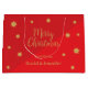 Um saco de presente de Natal vermelho e dourado minimalista com as palavras "Feliz Natal" e o nome personalizado que você pode facilmente remover ou personalizar.