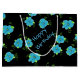 Grande bolsa de presente preto de alcaçuz com pequeno padrão azul de arte floral. Personalize o texto de aniversário feliz para se adequar a qualquer ocasião especial, ou o texto é removível. A cor preta de fundo pode ser alterada para a sua cor favorita. O padrão da ventoinha também é removível.