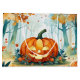Floresta de abóboras de outono, verde-alaranjado, com árvores de queda coloridas e folhas voadoras design.