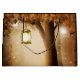 Saco de presentes com uma ilustração encantadora caprichosa em cores ricas castanho e amarelas. Uma floresta mística mágica com uma grande árvore segurando uma lanterna antiquada. Luzes de fada dançando ao redor. Um design maravilhoso e encantador.