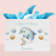 Saco de presentes com um golfinho azul e dourado giro cercado por bolhas de água. Você pode personalizá-lo alterando todos os textos. Fundo branco. No verso, um padrão de bolhas coloridas.