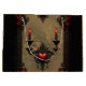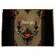Gótico Romance: Paixão Oculta. Um quadro de ornamentado no estilo gótico, desenhado com filigrana fina e preta, com linhas delicadas e detalhes intrincados que lembram as antigas entalhes de ornamentado. Incorporados no quadro estão rosas vermelhas brilhantes, suas flores velozes criando um contraste vibrante com o filigre escuro, ressaltando o humor romântico. Os ornamentos em forma de coração enfeitam os cantos e bordas do quadro. Duas velas pretas com chamas vermelhas brilham suavemente, dando à imagem geral um toque quente, ligeiramente sombrio.
