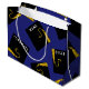 Saca de presente criativo de formatura para a sua turma favorita de graduados de 26 com boinas pretas e douradas em um fundo azul. Para personalizar, edite o texto para adicionar o nome do graduado e o ano da turma de formatura.